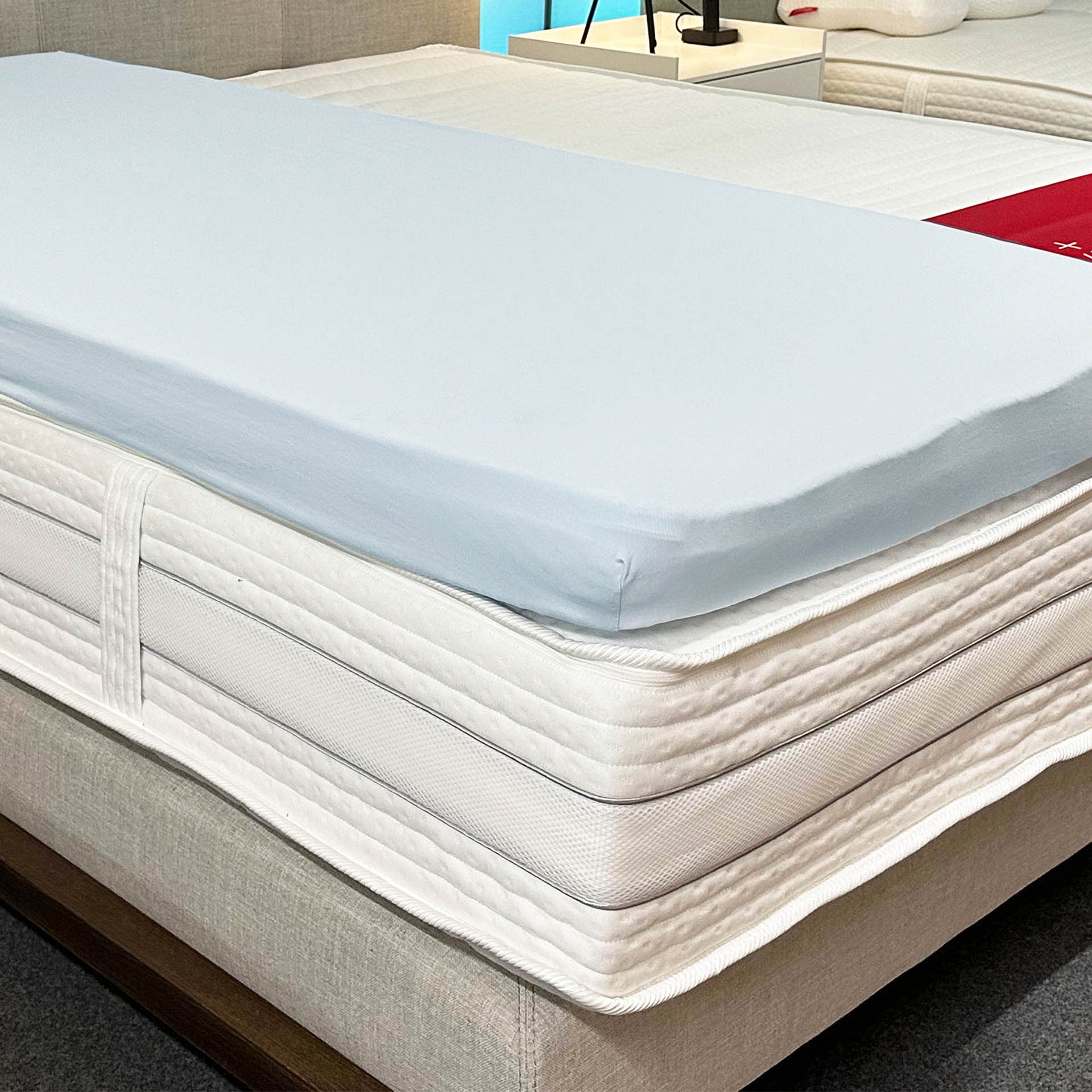 This is a fitted sheet for a mattress topper, as many box spring beds or upholstered beds are equipped with a topper, which provides additional comfort on top of the mattress. All fitted sheets from the Lotus Souplesse range are suitable as topper fitted sheets. For narrow toppers with a height of 6–8 cm, the excess fabric of the Lotus Souplesse fitted sheet is folded over and tucked under the topper. Thanks to the high elasticity of the Lotus Souplesse fitted sheet (6% elastane), it spreads out easily and can be smoothed out without any problems.